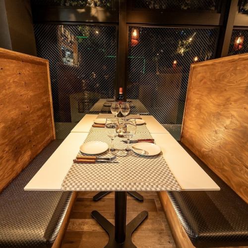 一张可容纳四人的桌子,非常适合休闲用餐或小型饮酒聚会。柔和的灯光和现代化的室内装饰营造出舒适的氛围。沙发座椅上柔软的坐垫非常舒适,营造出轻松的氛围。请您一边享受烤肉和正宗意大利美食,一边享受轻松的交谈。